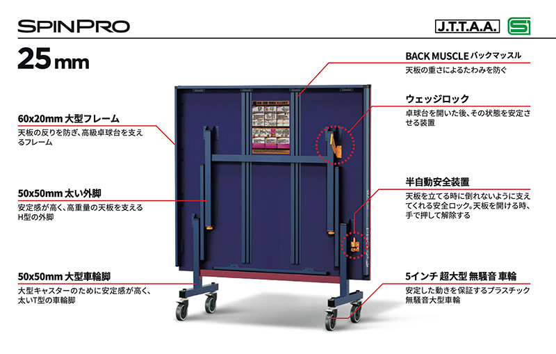 ITTF(国際卓球連盟)公認、3層レイヤーにUV加工を施した高品質な天板「SPINPRO」を採用したXIOM卓球台『PRO 9E』。天板表面にボールのスピンを非常に正確に反映するマイクロ粒子のUV加工をほどこした3層レイヤーの25mm 高密度天板が、均一で安定したバウンドを実現。XIOMらしい鮮やかなカラーリングでデザイン性も高い高品質な卓球台が、ITTF公認台としては破格とも言えるロープライスとなっている。