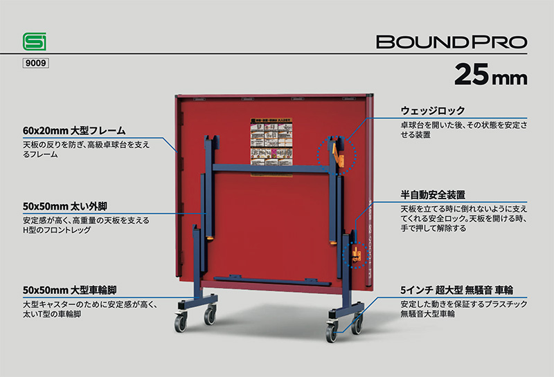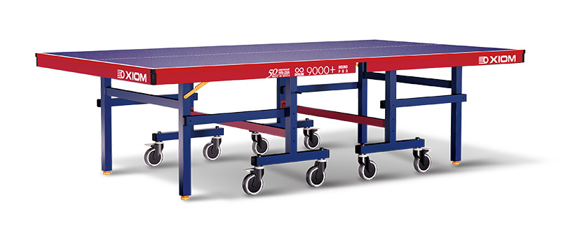 ITTF公認台と同等のPRO級の脚構造を採用した安定感、ボールの回転と反発にすぐれる厚さ25mmの天板を搭載した本格仕様の卓球台『9000+』。